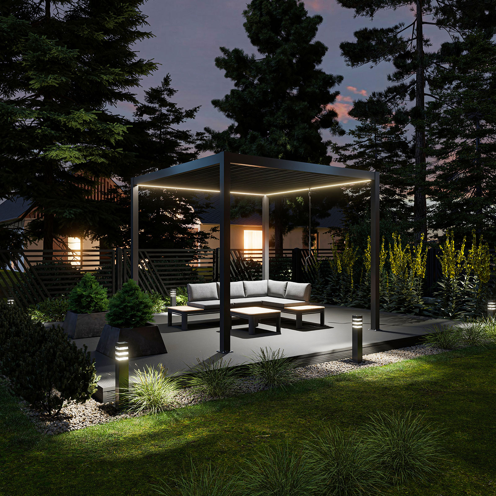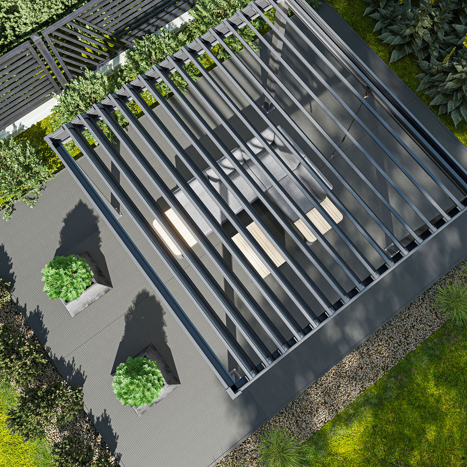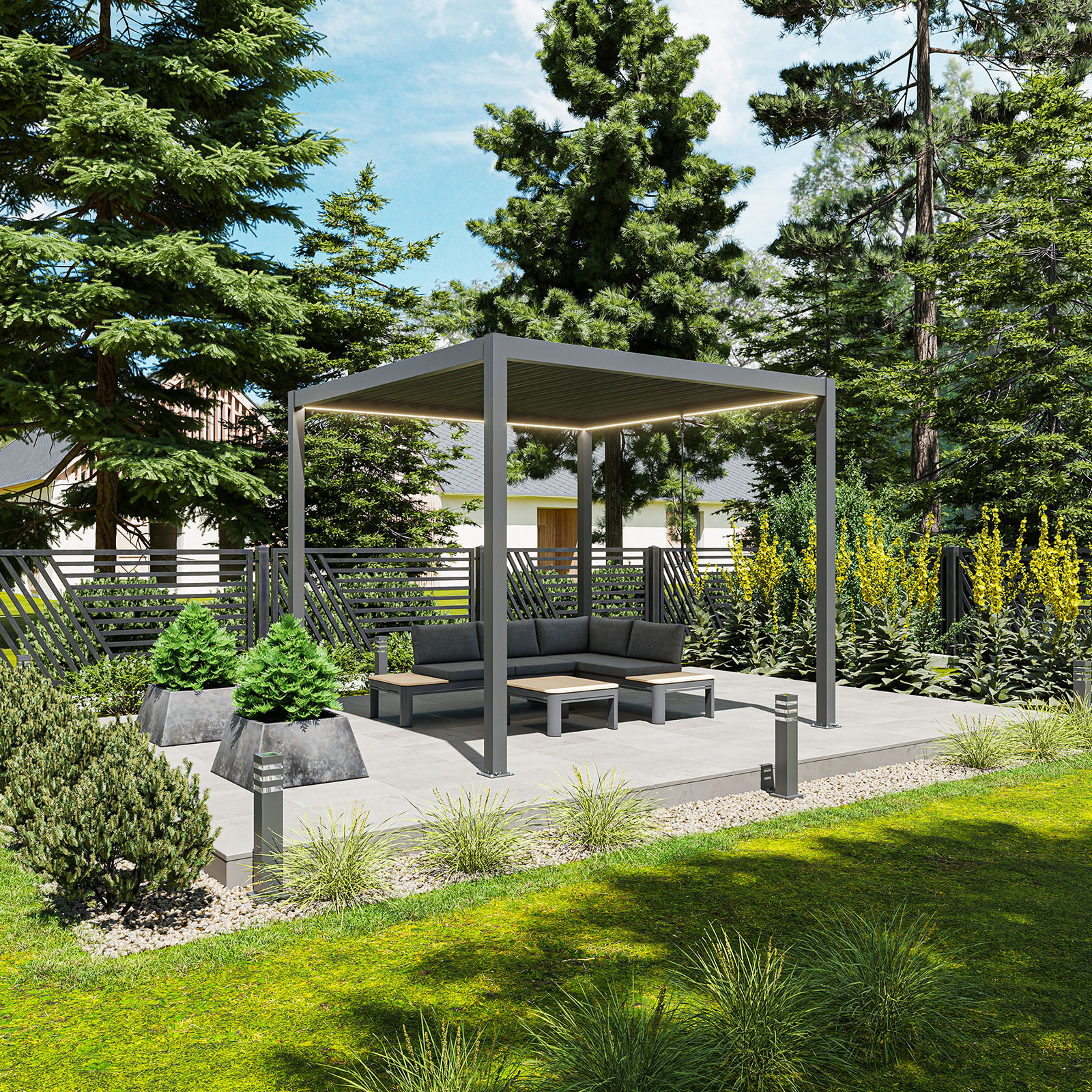 - Stylowy design: Opcjonalne oświetlenie LED podkreśla minimalistyczny charakter pergoli i dodaje elegancji przestrzeni wypoczynkowej.