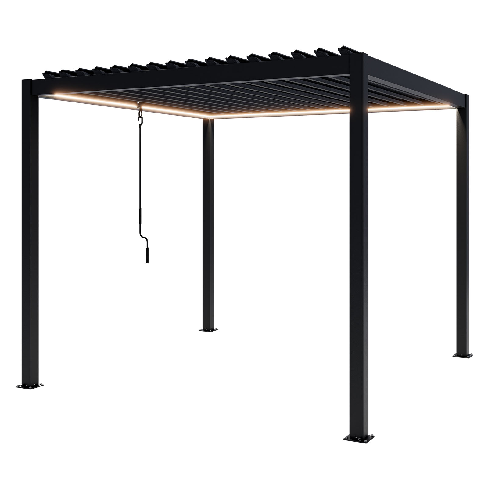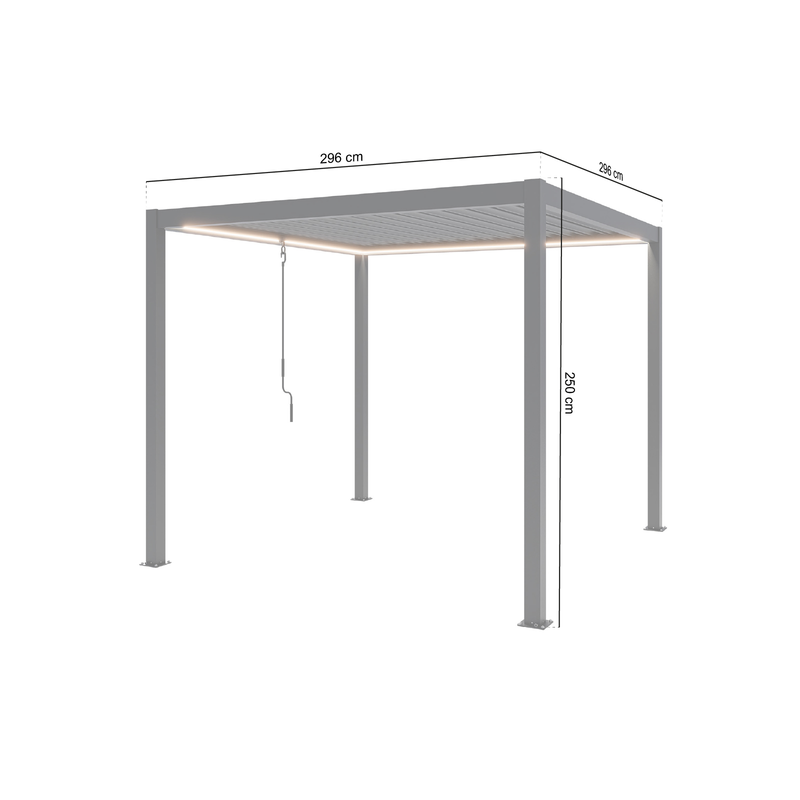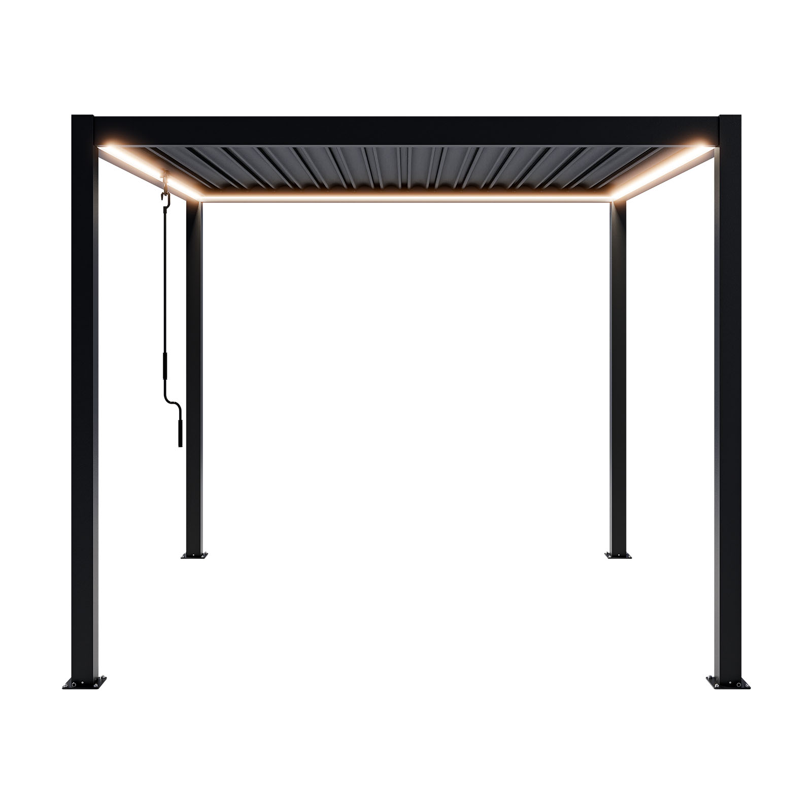 - Stylowy design: Opcjonalne oświetlenie LED podkreśla minimalistyczny charakter pergoli i dodaje elegancji przestrzeni wypoczynkowej.